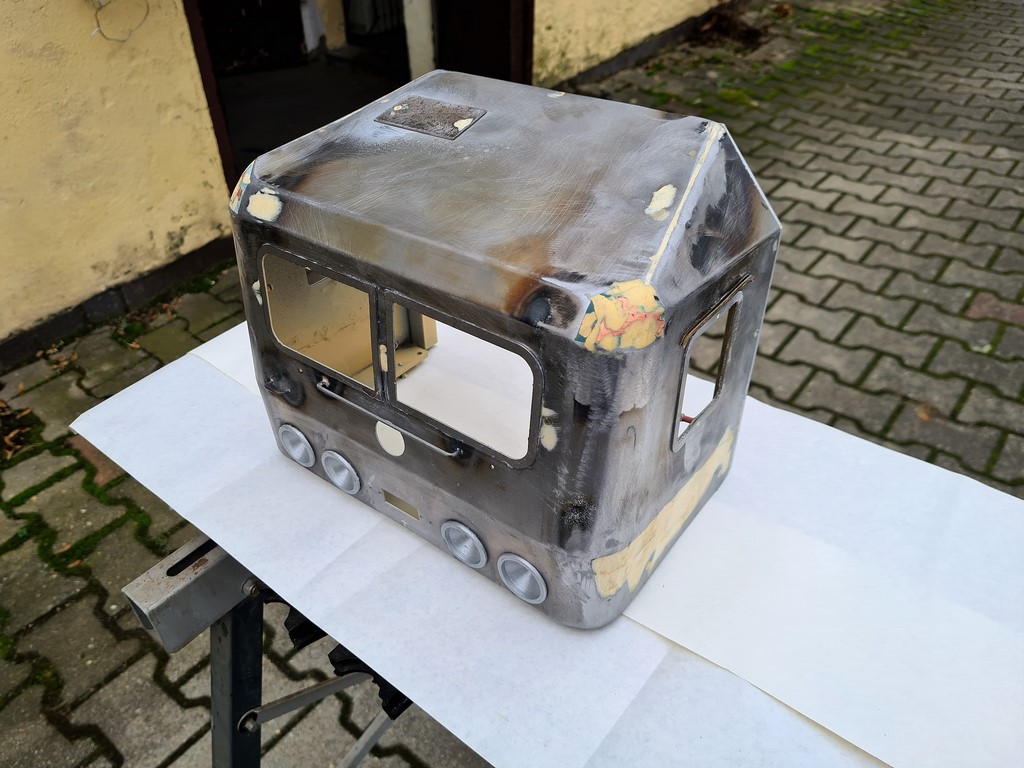 Als Nächstes sind die beiden Führerhäuser an der Reihe. Das sind relativ komplizierte Blechbiegeteile, die innenliegend mit Rahmen stabilisiert und in das Maß und die Winkel gezwungen werden. Die Schnittkanten werden nach dem Biegen hart verlötet und verschliffen. Diesen Bauzustand zeigt das untenstehende Bild.